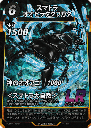 クワガタムシ科。体長31~102mm。スマトラ島に分布。体が厚く横幅が広い重量級のクワガタ。大アゴが短い分挟む力が強い。パラワンオオヒラタクワガタとともに最強のクワガタとも呼ばれる。