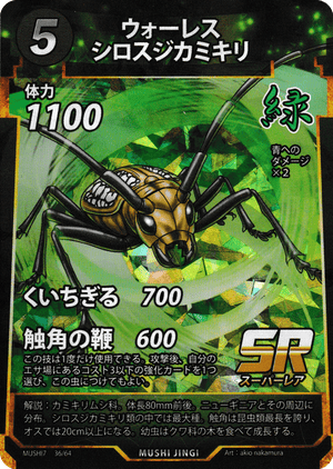 - この技は1度だけ使用できる。攻撃後、自分のエサ場にあるコスト3以下の強化カードを1つ選び、この虫につけてもよい。