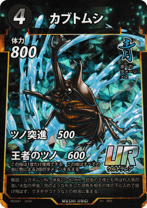 コガネムシ科。体長27~87mm。昆虫の王者とも呼ばれ人気の高い大型の甲虫。兜のような形をした頭角を相手の体の下に入れて投げ飛ばす。クヌギやコナラなどの樹液に集まる。