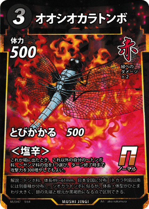 - これが場に出たとき、これ以外の自分の~トンボ科、~ヤンマ科の虫を1つ選び、ターン終了時まで攻撃力を300増やしてもよい。