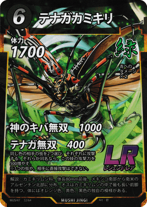 - 最大4回与えられます。"テナガ攻撃"によって相手の虫を2体選び、攻撃をしたあと、[草薙の紅剣]の効果が発動しもう一度だけ攻撃できるようになります。その後相手の虫を2体選べるのであれば"テナガ攻撃"で2回、選べないのであれば"キバ無双"で1回ダメージを与えることができます。