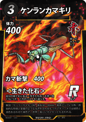 ケンランカマキリ科。体長30~40mm。東南アジアに分布。原始的な特徴と金属のような光沢を併せ持つカマキリ。メスは緑色と赤色を合わせた体色で、世界一美しいカマキリとも言われる。